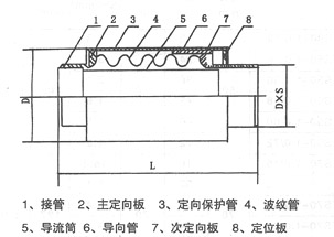 无约束管道伸缩器的定向保护管的一端和主定向板焊接,包容在定向保护管内的导向管通过次定向板和另一侧接管焊接,定位板与定向保护管焊接。因此该管道补偿器具有支撑和定向性能,同时定位板保护波纹管不被拉平。