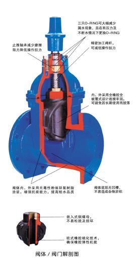 由于阀体内部以 性环氧树脂涂装,闸板的内外表面均以橡胶 包覆而不至于出现锈水或腐蚀现象,可供生饮。